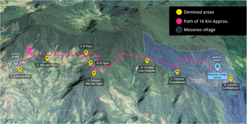 For more than two years, HALO’s dedicated demining teams painstakingly worked to remove hidden dangers from the landscape. Nearly 7 acres of land, the area equal to 3.5 soccer fields, were made safe after 33 explosive items were destroyed. Eight minefields along the path were carefully cleared, among its steep trails, small streams, and other life-giving natural resources. This work benefitted more than 260 community members who lived there despite the risk, and who now have a path to travel between the villages and to Mesones.