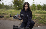 Team Commander Anastasiia holds what looks like a video game controller. She watches a small drone buzzing a few feet above the ground.