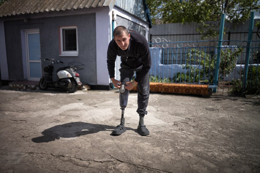 35-year-old Hennadii lost his leg in a mine accident in 2023, just three weeks after moving back home after the Russian occupation of his village in Kherson region. Hennadii had gone down to the Inhulets River with his friend to go fishing. After a successful fishing day, they were headed back along a well-trodden footpath when Hennadii stepped on a mine.