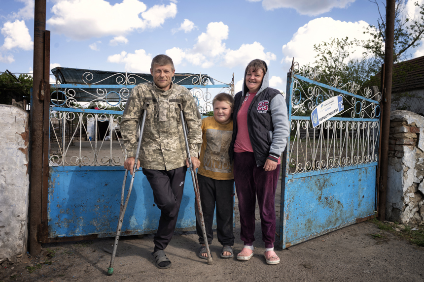 Yuliia also sustained injuries – she still has shrapnel in multiple parts of her body – but ran nearly a kilometer to get help. Volodymyr’s right leg was amputated from the knee down. Since shrapnel hit a central artery in his arm, he has lost use of three of his fingers.