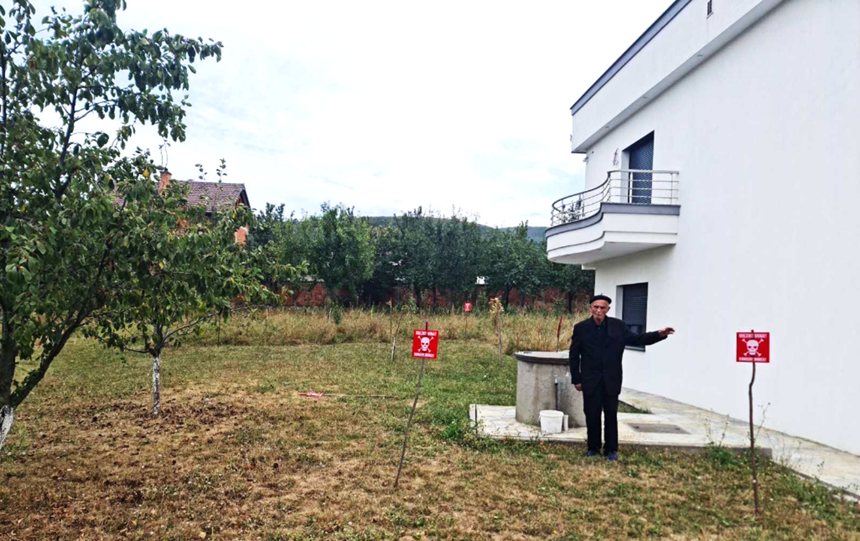 [left] Jakup Bujupi stands in front of his house where a buried cluster bomb was discovered. “If it wasn’t for HALO, I may not be here today with my family. I want to thank the deminers who cleared my yard and Schonstedt for the devices that found the bomb so close to my home,” he says.