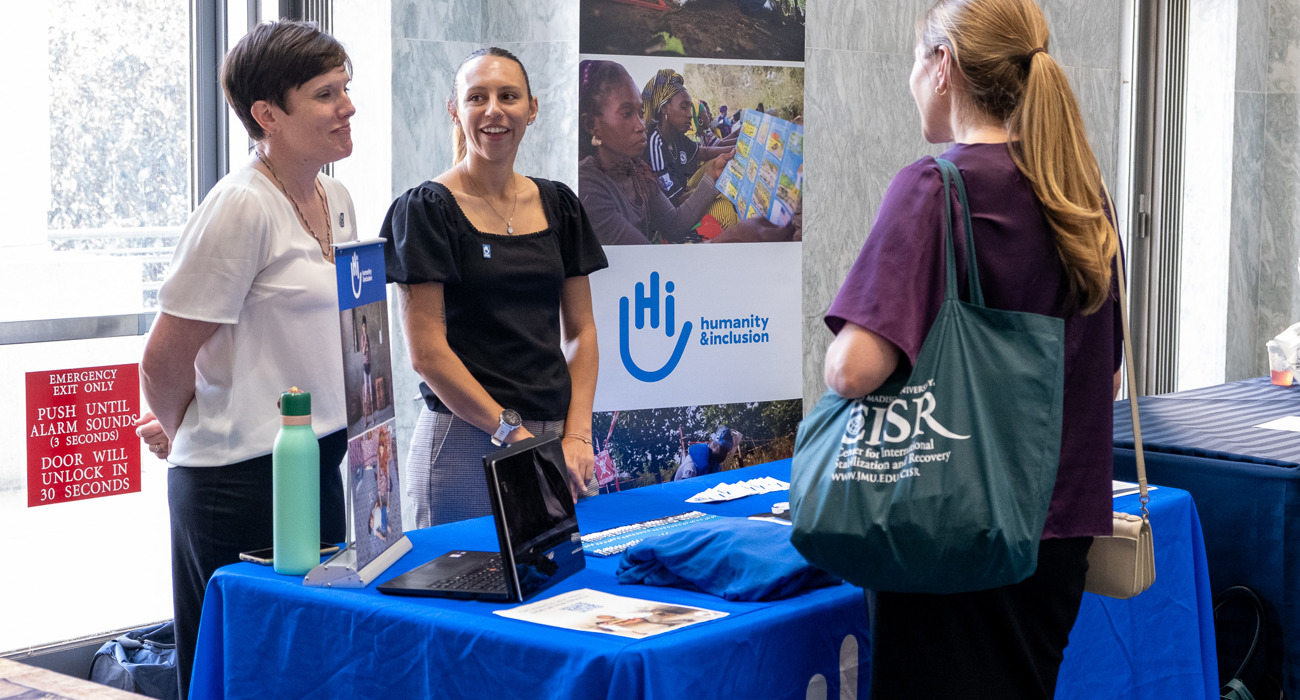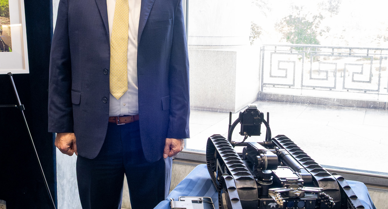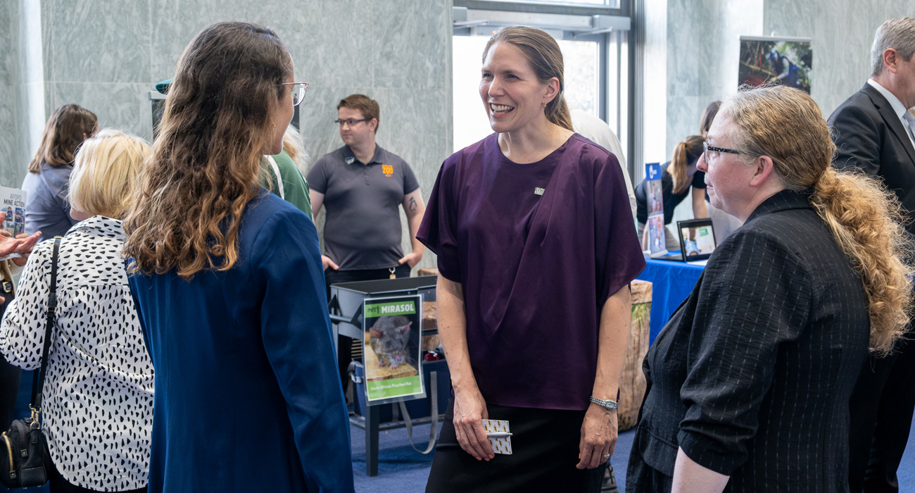 The event also featured a live demonstration of a demining rat, trained by APOPO and now living out retirement at the Maryland Zoo, as well as a retired K9 demining dog trained by the Marshall Legacy Institute. Also exhibiting were NGO partners including The HALO Trust, the Mines Advisory Group (MAG), PeaceTrees Vietnam, the Golden West Humanitarian Foundation, Legacies of War, Humanity & Inclusion, and JMU’s Center for International Stability and Recovery (CISR). The U.S. Army’s SLIC-Demining program (formerly Humanitarian Demining Research & Development), which develops new and specialized equipment for military and humanitarian demining, also displayed some of their cutting-edge equipment.